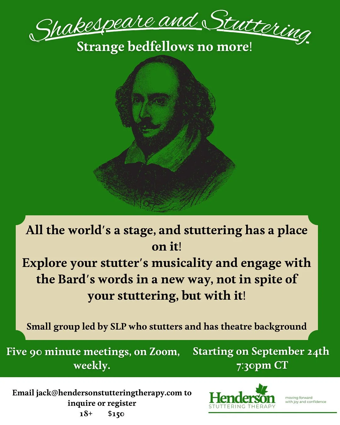 HST is starting a new 5-week group program where we aim to do just that! People who stutter will be vulnerable with one another and engage Shakespeare in a novel and stigma-busting way. This program IS NOT about using iambic pentameter or any rhythm to suppress stuttering. In fact, quite the opposite. Let’s test the boundaries of “eloquence” to include stuttering. Let’s show ourselves that any text, even Shakespeare, can have truth and beauty AND stuttering.